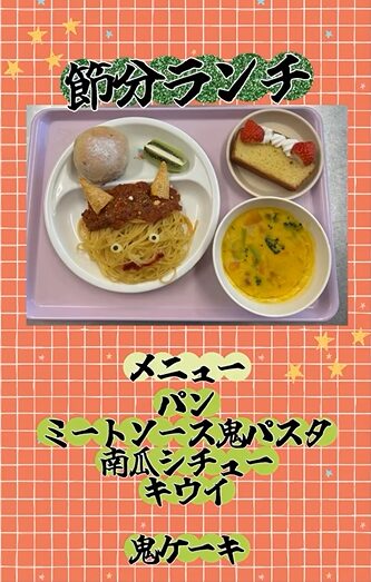 今日は節分ランチ👹🍽️ 鬼の顔に見立てたパスタにしてみました🍝前日から鬼パスタってなんだろう?🤔とワクワクしてくれていた子もいたようで、、☺️💓みんな喜んで食べてくれました✨ ケーキは鬼といいながらも少し可愛くなってしまいましたが、、😂美味しそうに食べてくれる子どもたちでした😊🍰